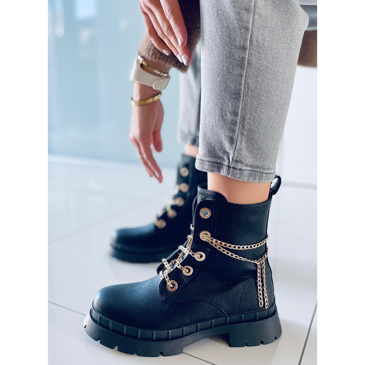 Lohan Black šněrovací kotníkové boty nesmí chybět v žádném dámském šatníku! Tyto poutavé černé kozačky se vyznačují originálním designem, který kombinuje pohodlí s módou. Namísto tradičního šněrování je tento model vybaven stylovým zlatým řetízkem, který dodává jedinečný charakter. Sada obsahuje také vyměnitelné tkaničky, což umožňuje personalizovat vzhled obuvi.
