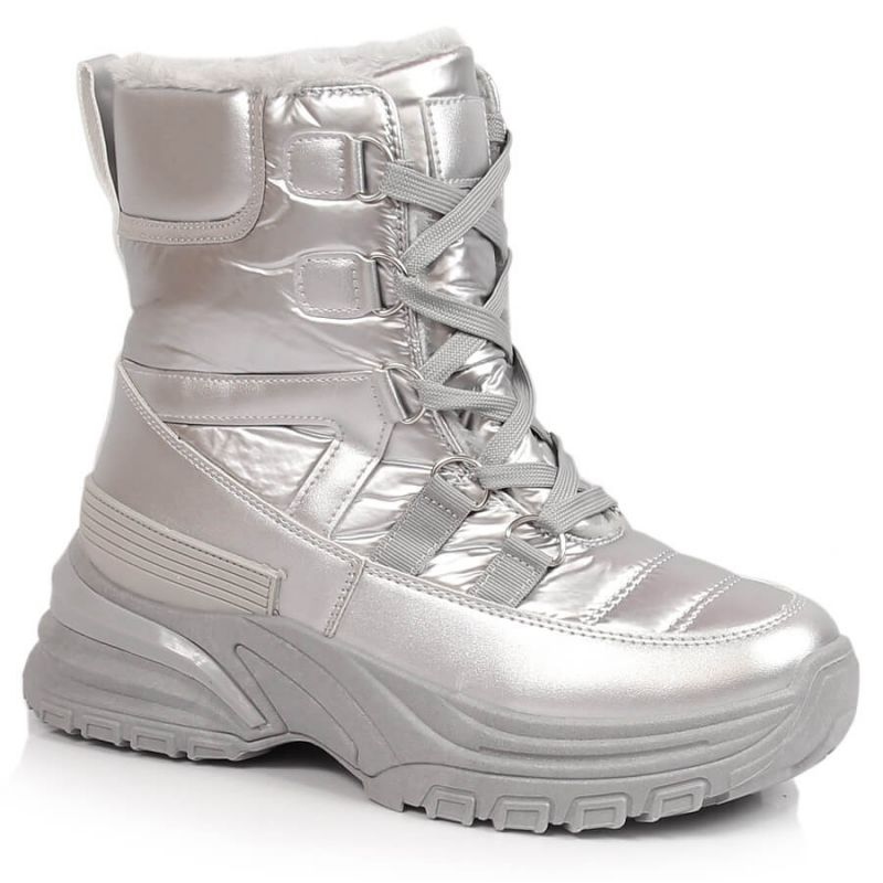 Moderní, módní ženské sněhové boty z Potocki, které kombinují efektivní kovový vzhled s praktickými vlastnostmi pro zimu. Vysoká horní a izolovaná podšívka zajišťuje tepelné pohodlí a přichycená spona zaručuje dobře na nohu. Univerzální stříbrná barva způsobuje, že boty dokonale odpovídají mnoha zimním stylizacím - od každodenního vzhledu měst po více výstupních sad.