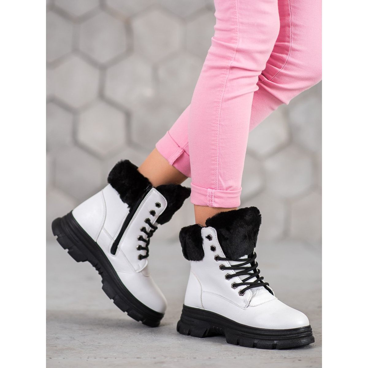 SHELOVET SHELOVET Šněrovací pracovníci s kožešinou bílý