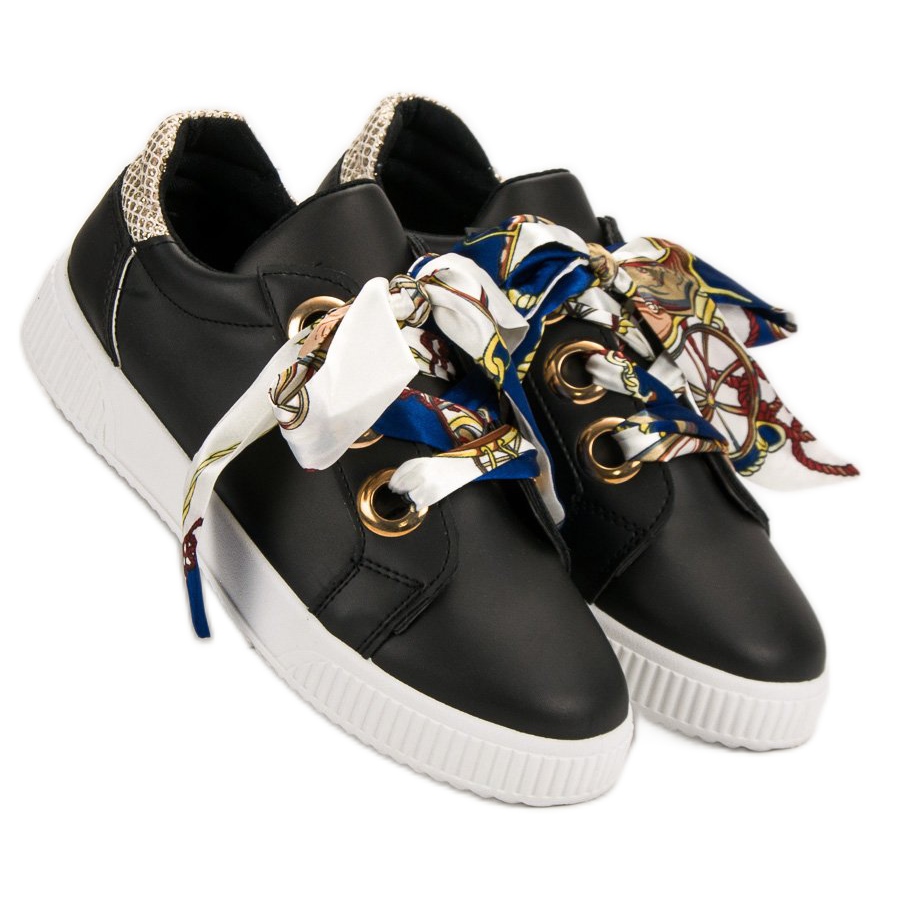 Černé sportovní boty se zavázanou stuhou jsou návrhem pro každou ženu, která si cení jak módního vzhledu, tak pohodlí. Bez vzoru, klasického střihu, se budou hodit ke každé kombinaci, od kalhot až po šaty.