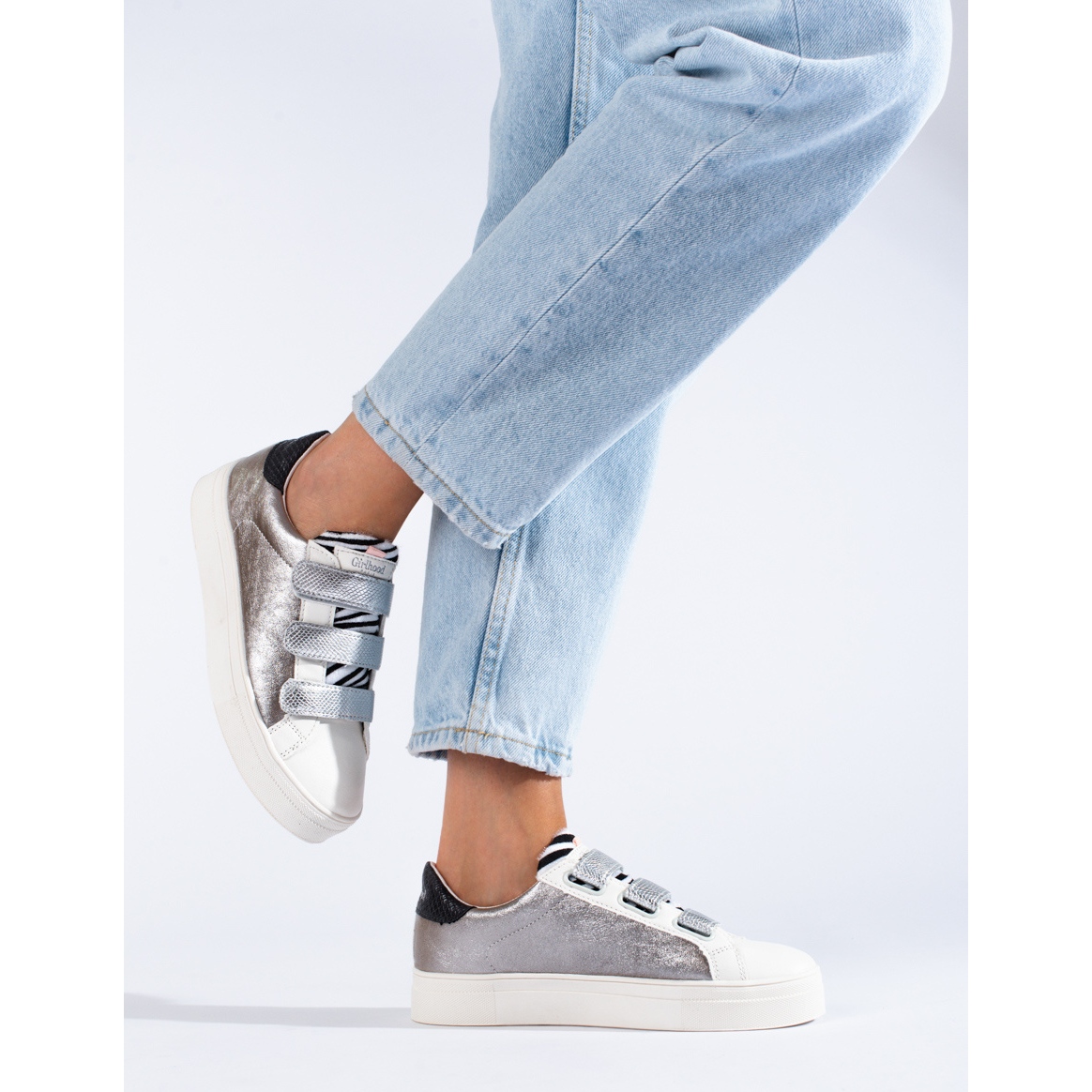 - Modelka: Stříbrné a bílé dámské tenisky na suchý zip