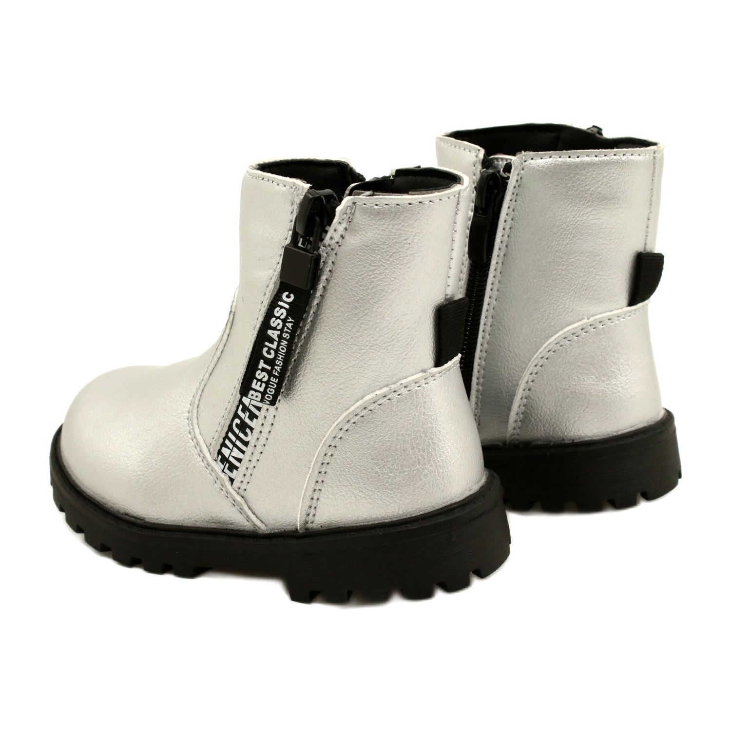 Elegantní, stříbrné boty pro dívku Miss 22DZ23-5268 jsou perfektní boty pro chladnější dny. Vyrobeno z vysoce kvalitní ekologické kůže, přitahujte pozornost s módním kovovým povrchem. Měkká, černá kožešinová uvnitř poskytuje příjemné teplo a praktický posuvník usnadňuje oblékání a vzletu. Termorošná podrážka je neklouzavá, což zvyšuje bezpečnost během procházek na mokrých nebo kluzkých površích.