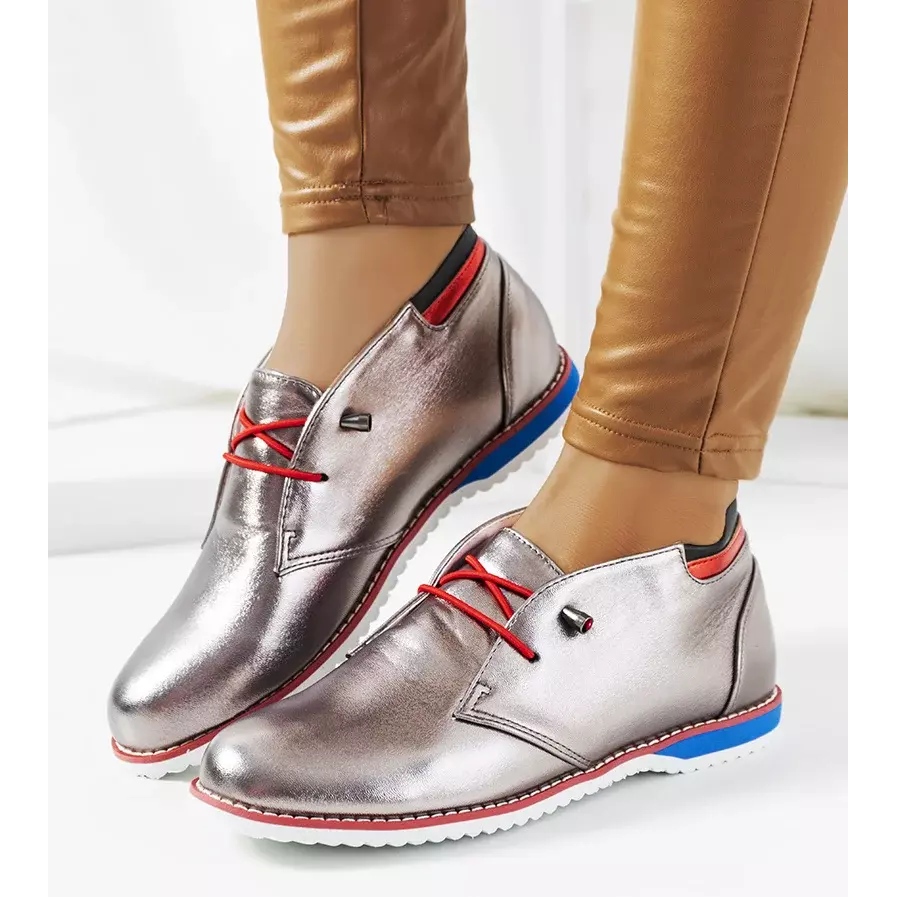 Stříbrné dámské boty Reyes jsou perfektní volbou pro ženy, které chtějí dodat lesk svým jarním stylizacím. Tyto elegantní boty vyrobené z vysoce kvalitní ekologické kůže vynikají poutavou metalickou barvou. Červené a modré akcenty jemně kontrastují s dominantní stříbrnou a dodávají obuvi originalitu a výraznost.