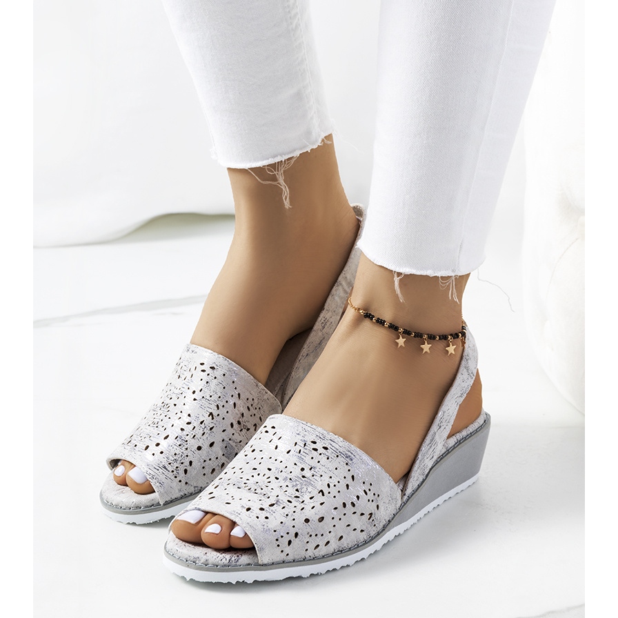 Objevte bezkonkurenční pohodlí a eleganci se stříbrnými sandály na klínku Sheripov! Tyto jedinečné boty vytvořené značkou Inna kombinují moderní design s poutavými detaily. Jsou vyrobeny z prolamovaného ekologického materiálu a hodí se jak na letní procházky, tak na večerní vycházky.