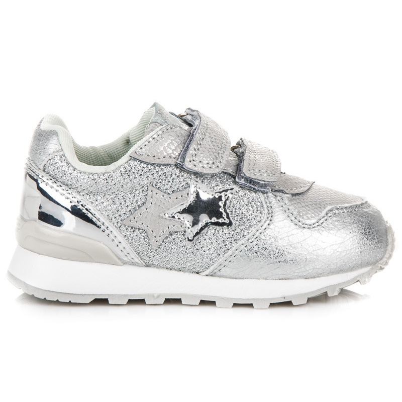 Stylové sportovní tenisky American Club ve stříbrno-šedé barvě - ideální pro každodenní školu a hru. Vyznačují se dvouhvězdičkovým vzorem na boku, perforovaným prodyšným svrškem a pohodlným zapínáním na suchý zip, díky kterému se snadno a rychle oblékají.