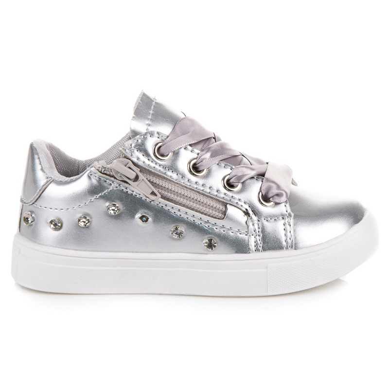 Stylové tenisky pro dívky, které kombinují módní vzhled s každodenním pohodlím. Svršek z ekologické kůže ve stříbrném, lehce třpytivém odstínu je zvenku zdoben krystaly a dívčí půvab dodává atraktivní stuha místo tradičních tkaniček. Model je také vybaven praktickým zipem, který usnadňuje obouvání a vyzouvání.