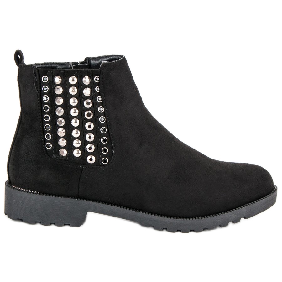 Černá barva a jemný kulatý tvar špičky je činí šik a jemný, plochý 3,0 cm podpatek zdůrazňuje ženský tvar obuvi a zároveň zajišťuje pohodlí při každodenním používání. Na bocích Chelsea bot jsou řady lesklých kamínků, které jim dodávají charakter a přitahují pozornost.