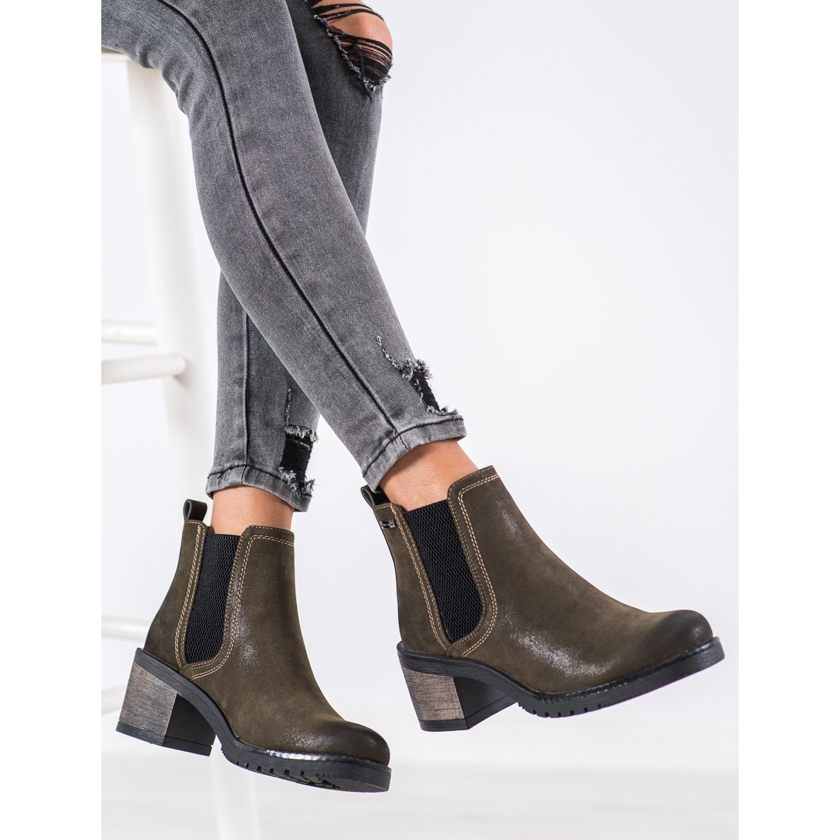 Stylové holínky Sergio Leone Chelsea v zelené barvě jsou dokonalou kombinací elegance a pohodlí, která dokonale zapadá do módních trendů pro sezónu podzim/zima. Tyto dámské kotníkové boty vyrobené z kvalitní ekokůže se vyznačují kulatou špičkou a módním blokovým podpatkem o výšce 6,5 cm, který zajišťuje nejen atraktivní vzhled, ale i stabilitu při nošení.