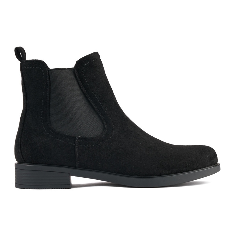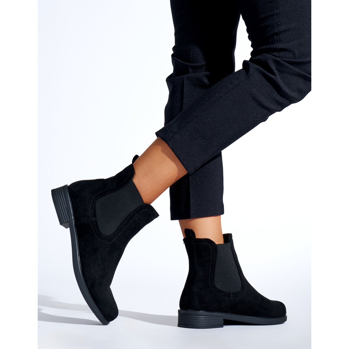 Elegantní Chelseats vyrobené z napodobovacího semiše (100% ekologické kůže semiš) v klasické černé barvě. Model kotníku (výška horního 12–13 cm) se zaobleným nosem a plochým patem/3 cm klíny zajišťuje stabilitu a pohodlí po celý den. Vložená struktura (typ upevňovacího prvku: sklouznutí) a měkká, postavená pata usnadňují instalaci a dobře se přizpůsobí noze. Plastová podrážka s běhounem zaručuje přilnavost na mokrých površích a textilní stélka a vnitřní izolace budou fungovat v podzimní/zimní sezóně.