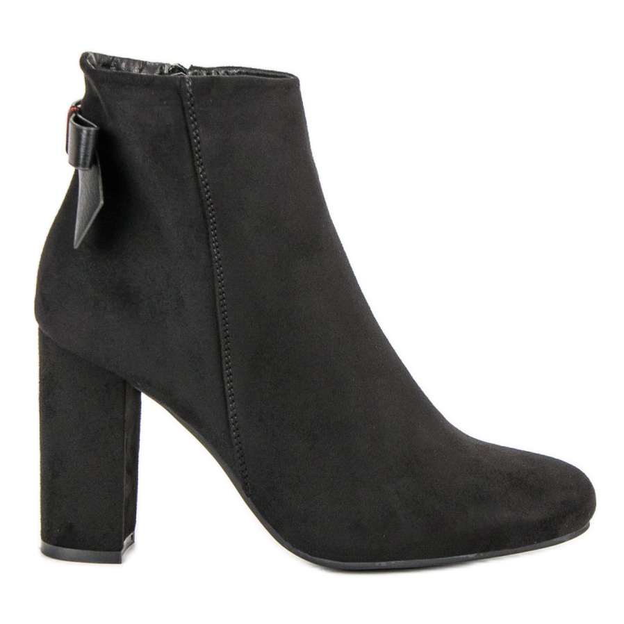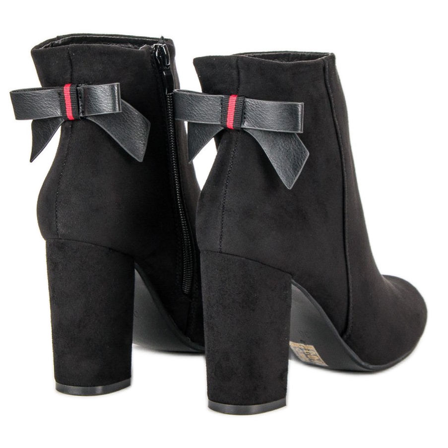 Vysoký, 9,5 cm silný podpatek v podobě kvádru poskytuje stabilitu a komfort nošení po celý den. Další výhodou je mašlička zdobící boty, která jim dodává jemný, ženský akcent. Černé kotníkové boty mají kulatou špičku, díky čemuž jsou pohodlné a vhodné pro dlouhodobé nošení.