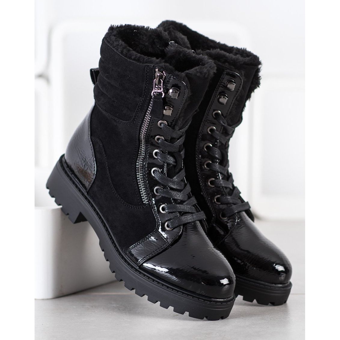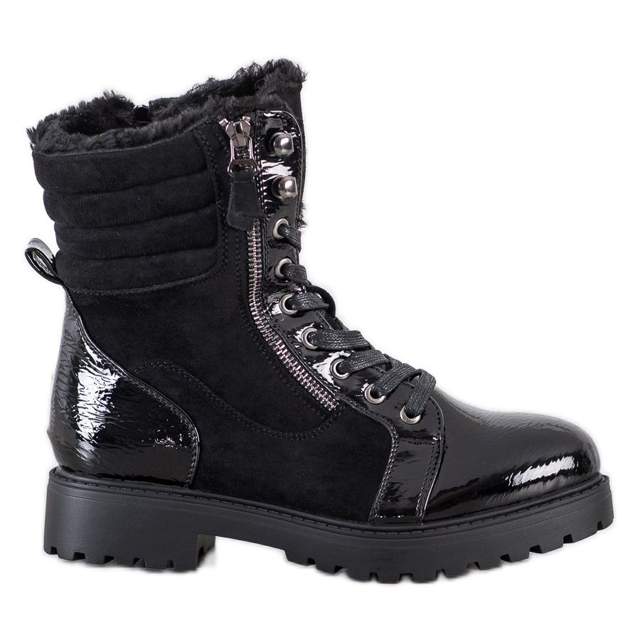 Boty jsou vyrobeny z kvalitních materiálů, mají svršek z ekologické kůže a měkký textilní vnitřní materiál, který zaručuje pohodlí při nošení. Černý lakovaný povrch jim dodává elegantní charakter a kulatá špička a vybudovaná měkká pata zajišťují dokonalé padnutí a pohodlí.