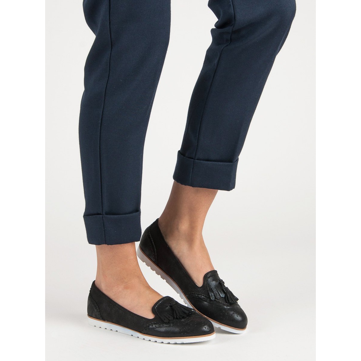Na svršku obou bot jsou decentní ozdobné třásně a precizně provedené prošívání, které jim dodávají jedinečný charakter. Díky kulaté špičce a výšce platformy 1,5 cm jsou mokasíny nejen stylové, ale také pohodlné po celý den.