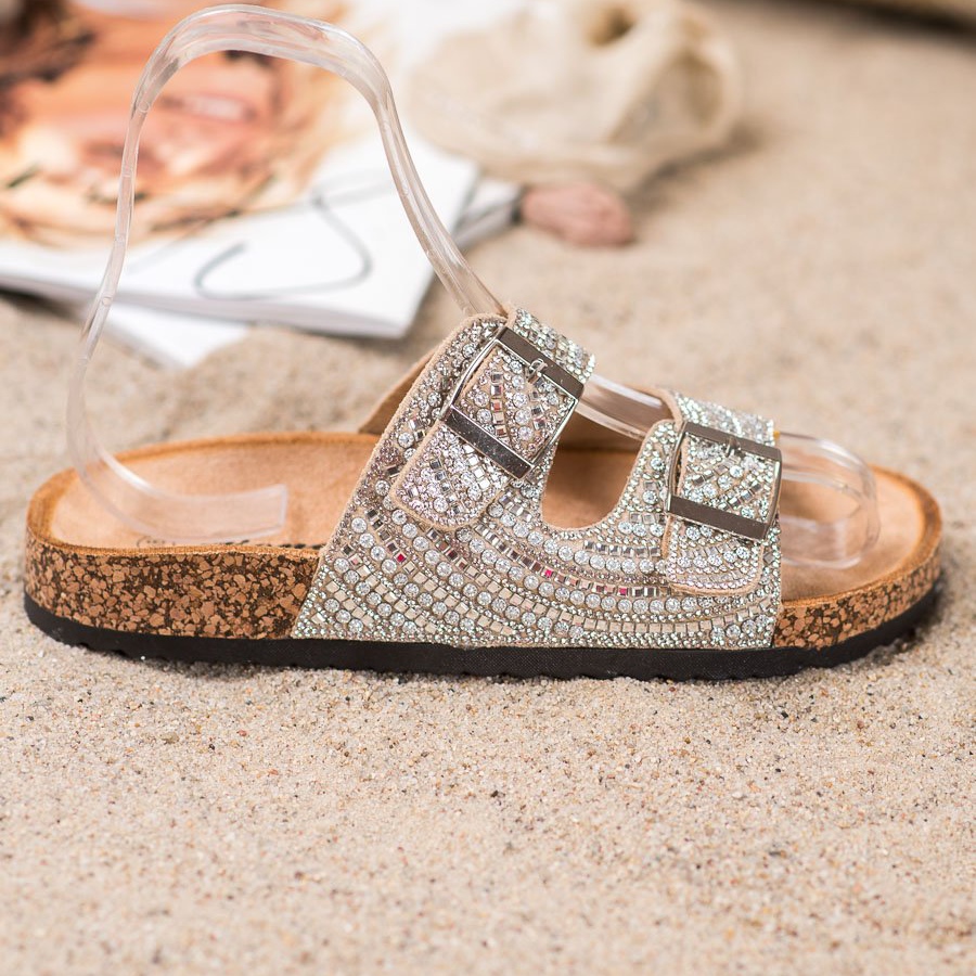 Dvě přezky zdobené lesklými krystaly a kamínky jim dodávají jedinečný styl a stávají se oblíbeným prvkem vašeho letního šatníku. Klopy se nazouvají pro snadné nazouvání a vyzouvání a otevřená pata poskytuje prodyšnost, ideální pro teplé dny.
