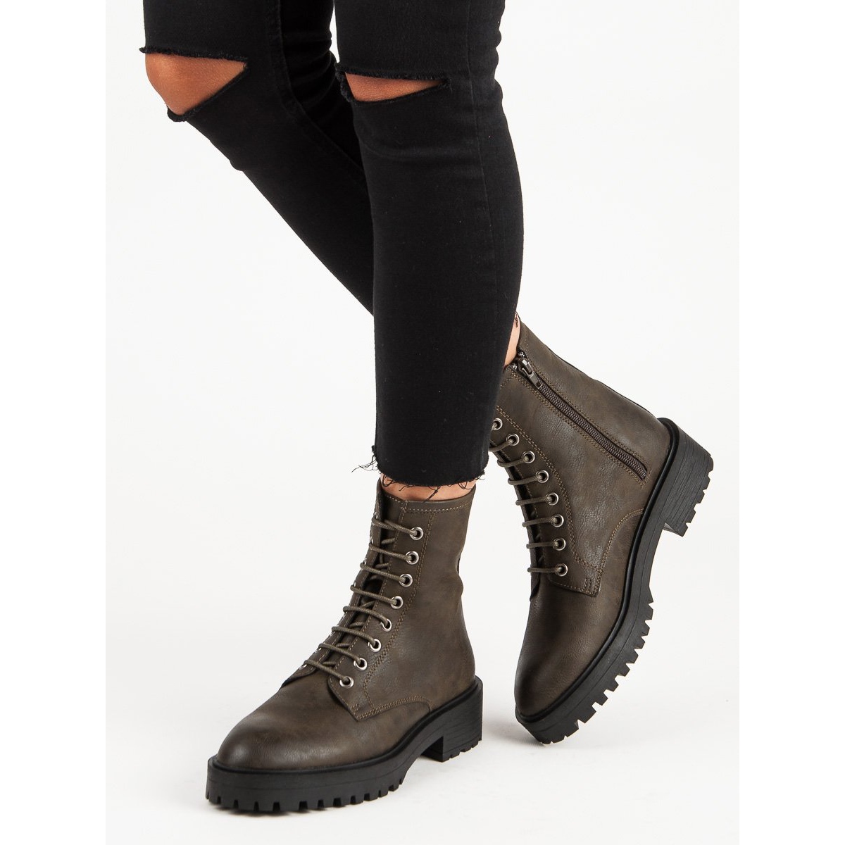 Tmavě khaki workery z vysoce kvalitní ekologické kůže se skvěle hodí k podzimnímu stylingu. Díky jejich univerzálnímu designu se hodí k mnoha různým outfitům – od džínů a svetrů až po šaty a dodávají každému outfitu styl.