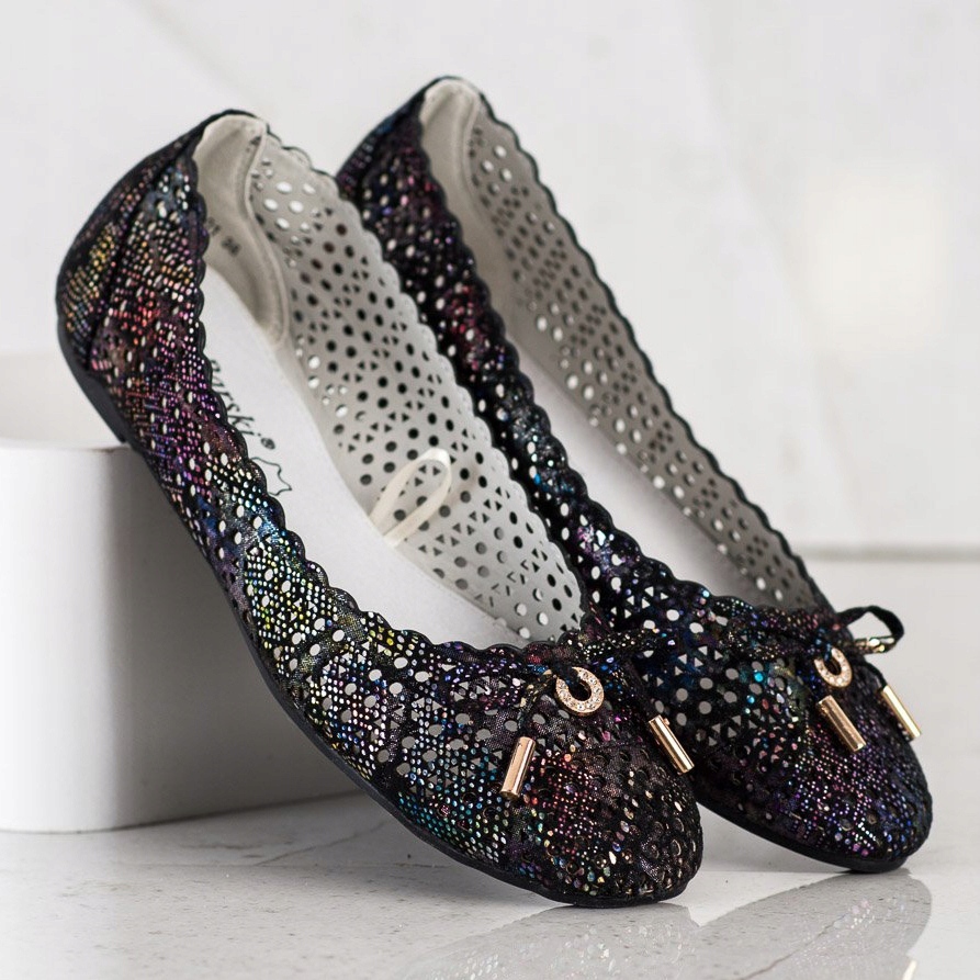 Stylové prolamované pestrobarevné balerínky od S. BARSKA jsou ideální nabídkou pro ženy hledající pohodlí a eleganci pro jarní a letní dny. Tyto moderní balerínky se vyznačují jedinečným designem - svršek je pokryt prolamovaným vzorem v odstínech černé, který se na slunci třpytí a vytváří velkolepý barevný efekt.