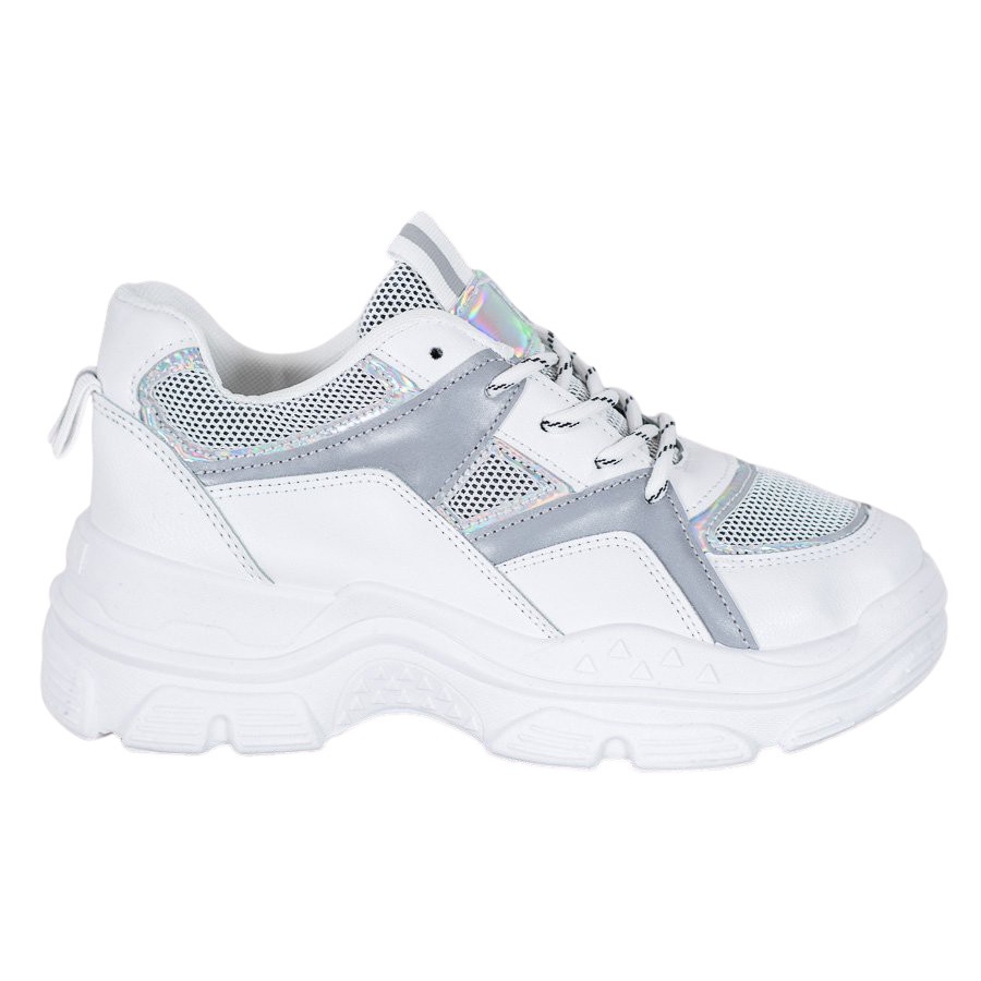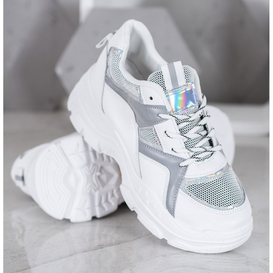 Bílé a šedé tenisky vyrobené z vysoce kvalitního materiálu imitujícího kůži se hodí pro každé roční období. Stříbrné akcenty dodávají eleganci, díky čemuž jsou dokonalým doplňkem městského stylu. Vysoká platforma vysoká 5,5 cm nejen podtrhne ženský styl, ale zajistí i pohodlí při nošení.