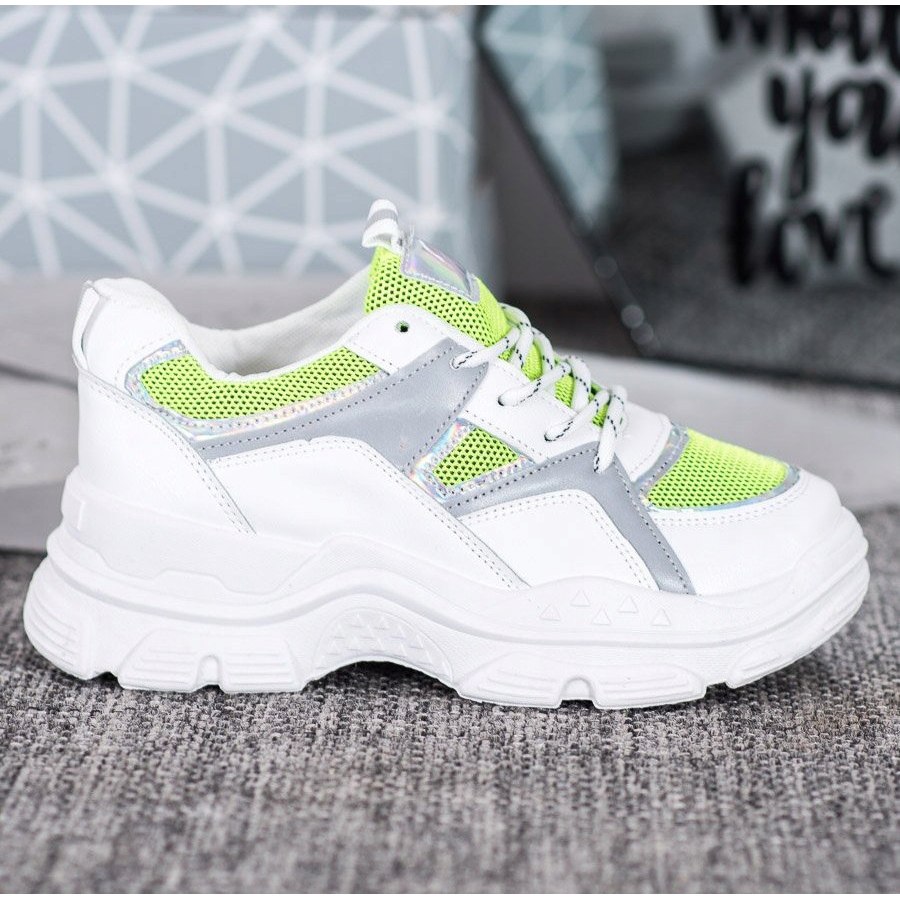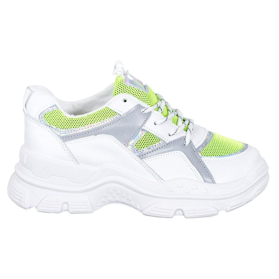 Objevte dokonalou kombinaci pohodlí a módního stylu se šněrovacími teniskami od Sweet Shoes! Tento model, který přitahuje pozornost svým bílým základem a neonově zelenými akcenty, zajistí, že každý váš styling získá jedinečný charakter.