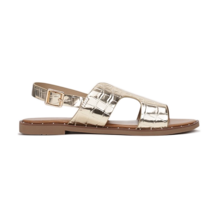 Tyto klasické ploché sandály mají zapínání na přezku nad patou pro dokonalé padnutí a pohodlné nošení. Díky otevřeným špičkám, patám a bokům jsou ideální pro teplé dny a kovový odstín zlaté dodá lesk každému stylu.
