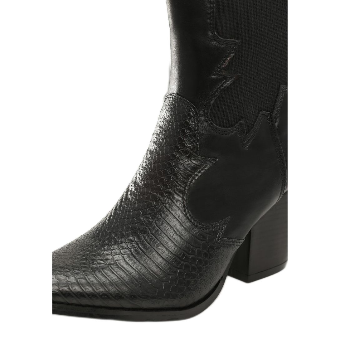 Kovbojské boty Vices se vyznačují 8 cm vysokým kónickým podpatkem, který dodává jemnou eleganci a zároveň zajišťuje stabilitu. Špičatá špička zdůrazňuje jejich originální tvar, díky čemuž jsou perfektním doplňkem jak pro každodenní, tak pro sofistikovanější styly. Vyrobeny z vysoce kvalitní ekokůže jsou nejen vzhledově atraktivní, ale také šetrné k životnímu prostředí.