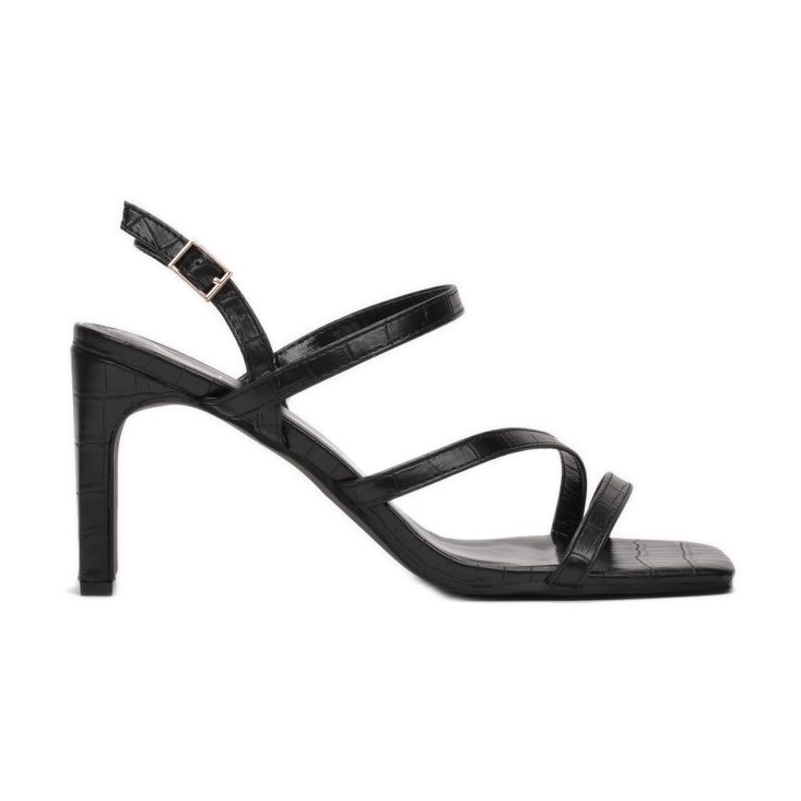 Vysoký sloupek o výšce 8 cm dodává siluetě štíhlost a zároveň zaručuje stabilitu při chůzi. Zapínání na přezku usnadňuje nazouvání a přizpůsobení obuvi vaší noze. Sandály nemají špičku, což jim dodává lehkost a moderní charakter.