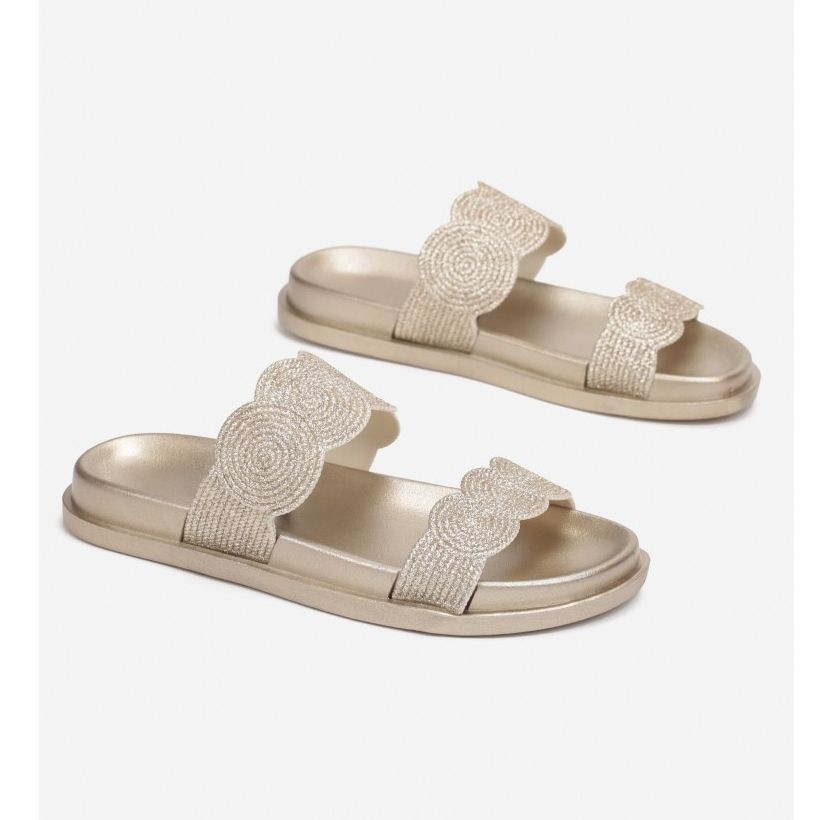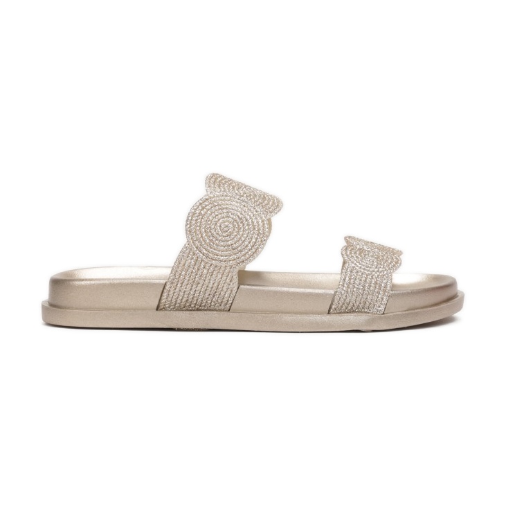 Představujeme nazouvací skluzavky Vices GJ-3-60-zlaté, které spojují pohodlí s módním stylem! Tyto jedinečné žabky v elegantní zlaté barvě upoutají pozornost originální podobou a efektními, zvlněnými pruhy zdobenými třpytkami. Díky odhalené špičce a střední části chodidla mohou vaše nohy dýchat a budete se v nich cítit pohodlně po celý den.