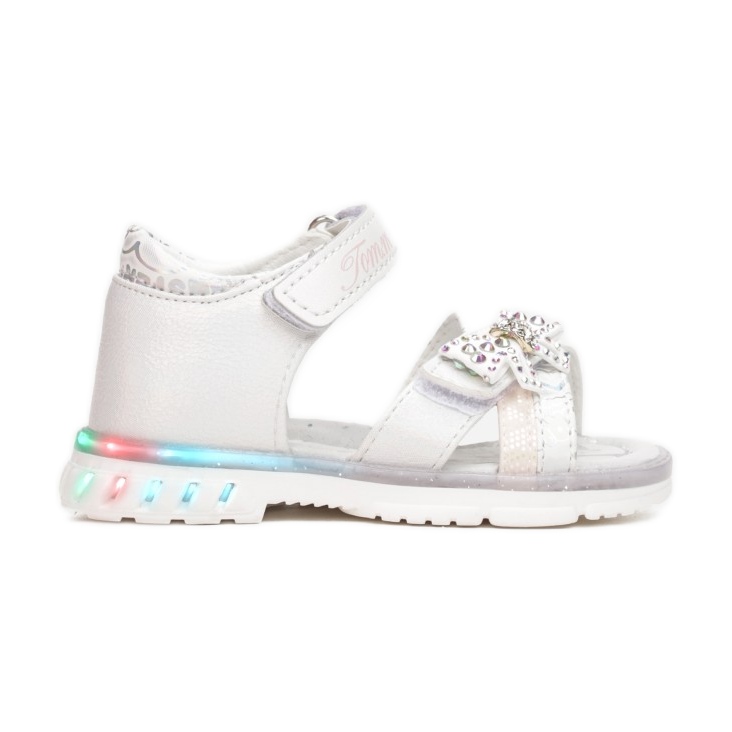 Sandály Vices T9225-LED-71-bílé jsou perfektní volbou pro každou malou parádnici, která chce vyniknout v davu! Tyto bílé sandály s otevřenou špičkou a zvýšeným podpatkem spojují eleganci a funkčnost. Sandály na ploché podrážce s nášlapem mají zabudovaná barevná LED světla, která jistě upoutají pozornost a dodají lesk každé ponožce.