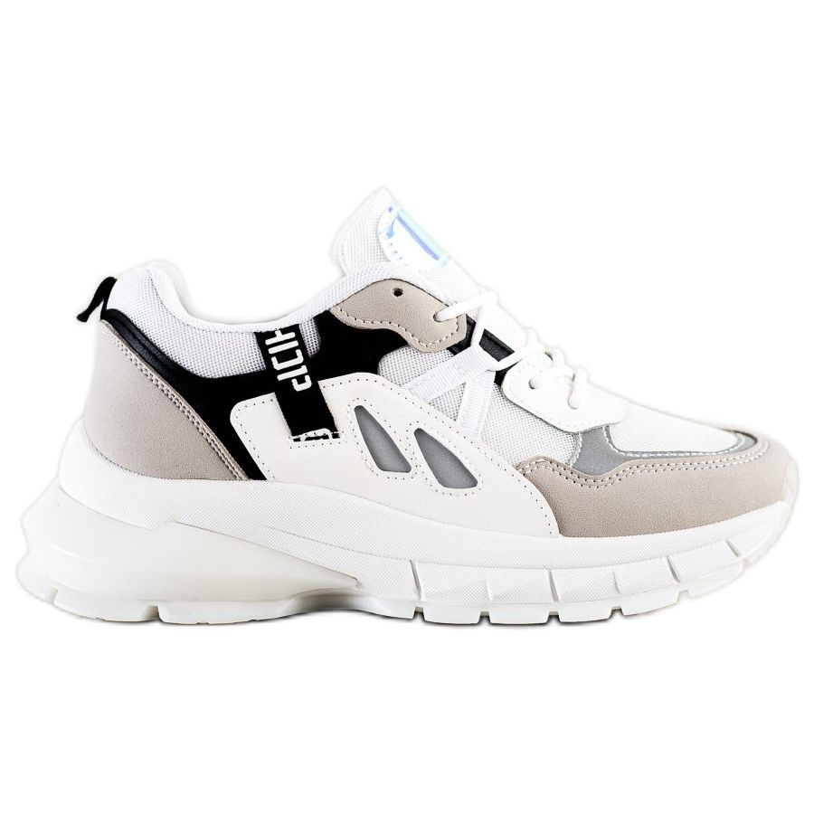 Tenisky na platformě SHELOVET jsou perfektní volbou pro ženy, které chtějí spojit pohodlí s originálním vzhledem. Vyrobeny z vysoce kvalitního materiálu imitujícího kůži a prodyšné síťoviny zajišťují komfort nošení i během dlouhého dne. Vícebarevné vsadky v odstínech bílé, šedé a černé na svršku jim dodávají moderní charakter a modrý akcent s holo efektem dělá boty poutavými a vynikne v davu.