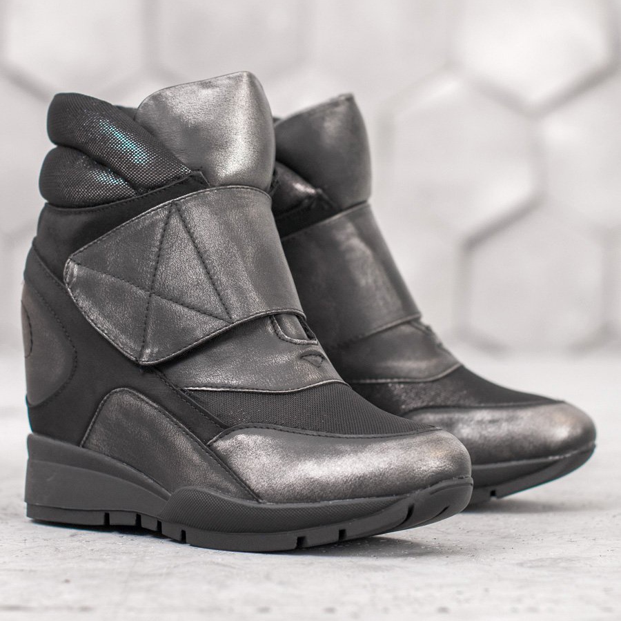 Tenisky vyrobené z vysoce kvalitní ekologické kůže poskytují nejen elegantní vzhled, ale také odolnost. Díky vybudovanému klínku a gumové podrážce tyto boty opticky zeštíhlují nohu a zároveň zajišťují komfort nošení po celý den. Kulatá špička dodává jemnost a zapínání na suchý zip usnadňuje nazouvání a svlékání.