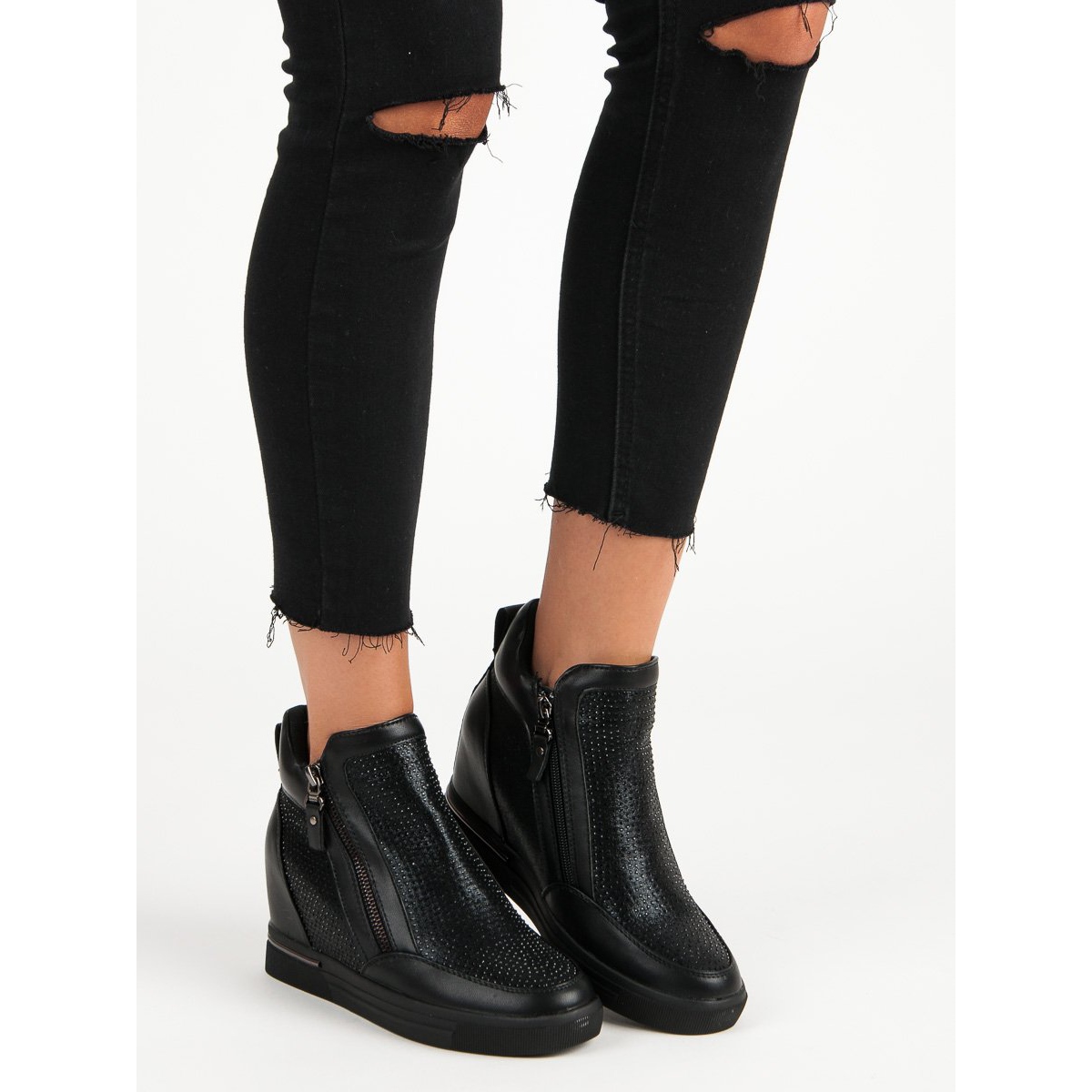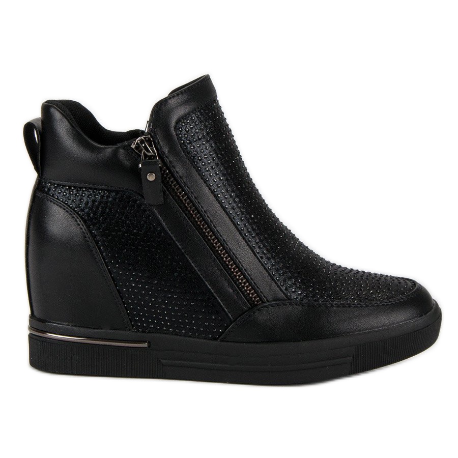 Černé tenisky na zip jsou perfektní volbou pro ženy, které ocení styl i pohodlí. Tyto elegantní boty se zapínáním na zip se vyznačují ozdobnými krystaly, které jim dodávají šik vzhled. Díky vysokému podpatku 7,5 cm a skryté platformě 2,5 cm nabízí tyto tenisky nejen efekt prodlužující nohy, ale také stabilitu a pohodlí.