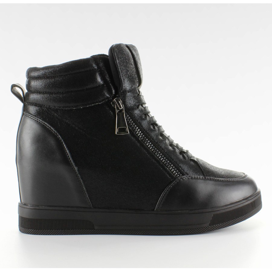 Tenisky R13 - černé, se skrytým klínkem (6,5 cm), kombinují sportovní charakter s ženskou siluetou. Vysoký kotníkový svršek zdůrazňuje nohu a skrytý klín diskrétně zeštíhluje a přidává pár centimetrů, aniž by obětoval pohodlí. Ozdobné šněrování vpředu dodává styl a praktické zipy na bocích usnadňují oblékání a rychlé svlékání.