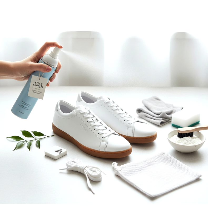 Světlé tenké tenisky jsou krásné, ale vyžadují pravidelnou péči. Základem je ochrana před nečistotami ihned po koupi: impregnační sprej na látky a kůži je povinným krokem před prvním nošením. Naneste rovnoměrně a před odchodem z domu nechte zaschnout.