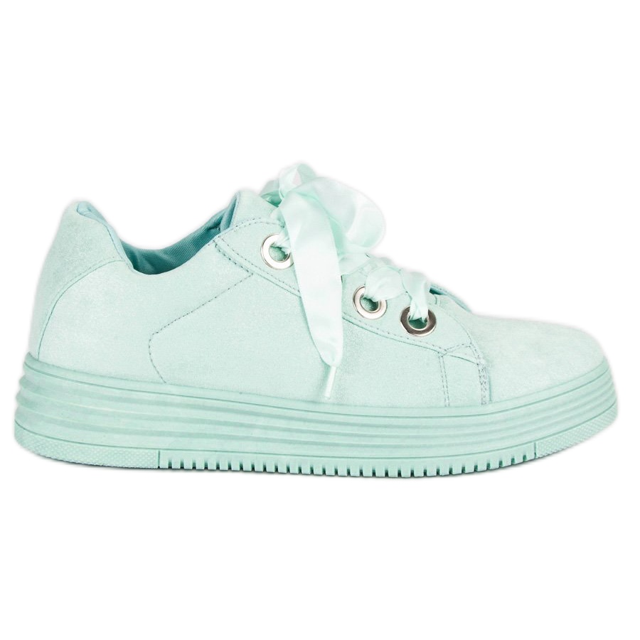 Objevte jedinečný styl a pohodlí s mátově zelenými semišovými teniskami! Tyto neobvyklé boty kombinují ležérní vzhled s nádechem elegance díky saténovým stylizovaným tkaničkám. Jejich pastelové barvy dokonale odpovídají současným trendům a 3,5 cm gumová nášlapná platforma jim dodává sportovní charakter, ideální pro každodenní nošení.