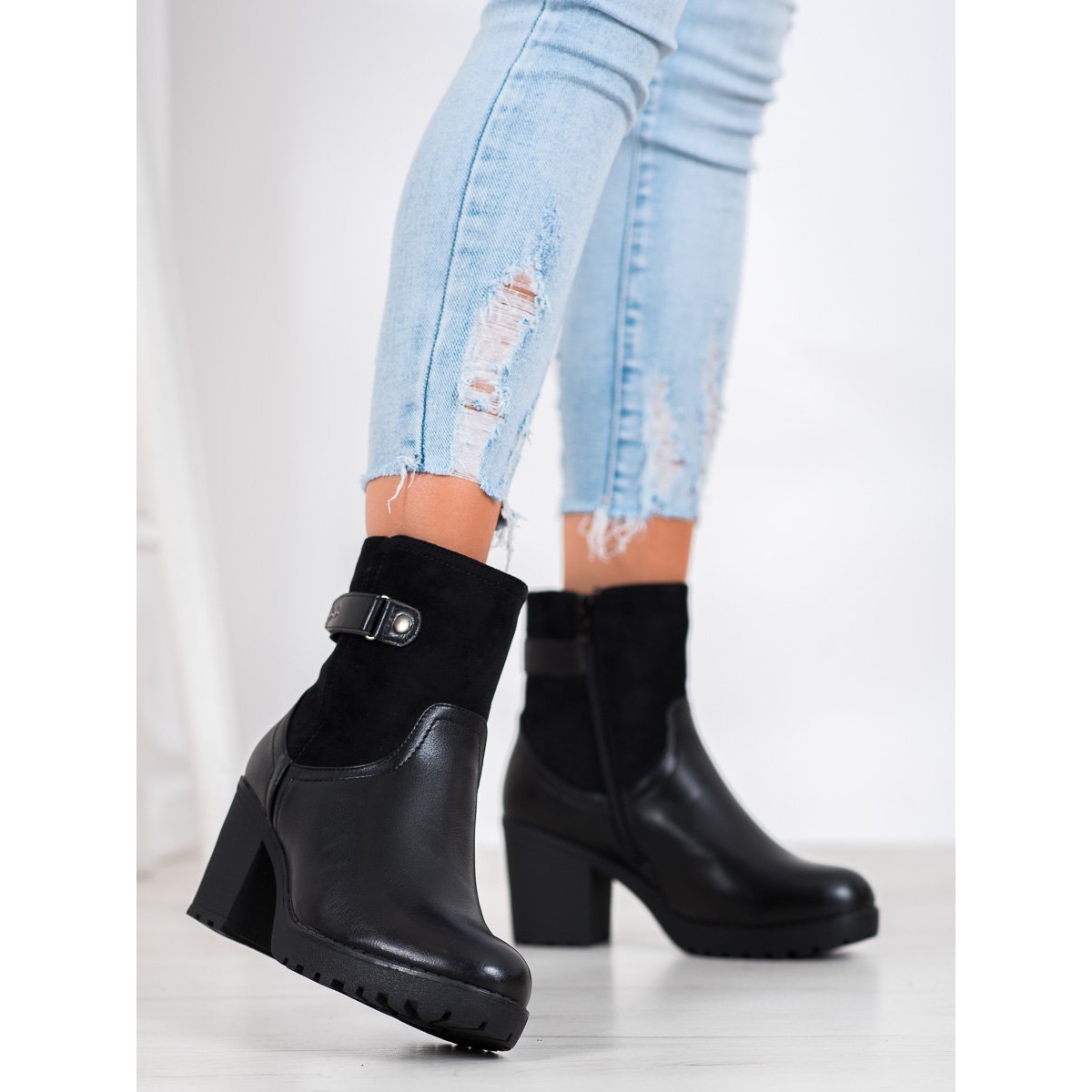 Tyto kotníkové boty s podpatkem o výšce 8 cm nabízejí stabilitu, zatímco malá platforma vpředu zajišťuje pohodlí i při dlouhé chůzi. Vestavěná vyztužená pata a praktický zip usnadňují obouvání a vyzouvání. Další výhodou je ozdobná lišta, která jim dodává jedinečný charakter.