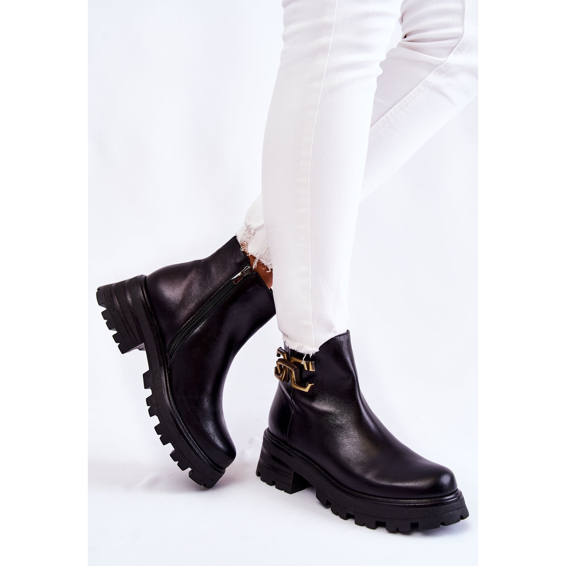 Klasické a módní ženské boty vyrobené z přírodní kůže - ideální pro chladnější dny. Model je zabudován na stabilní plochý patu (6 cm) a platformu (3,5 cm), které zajišťují pohodlí i během delšího nošení. Uvnitř jsou izolace ve formě přikrývky z měkké obuvi a ztuženou patou, která dává další teplo a stabilizaci nohy. Stylový řetězec v horním přidávání přidává postavu a dělá boty skvělé pro každodenní i více výstupní stylizace.