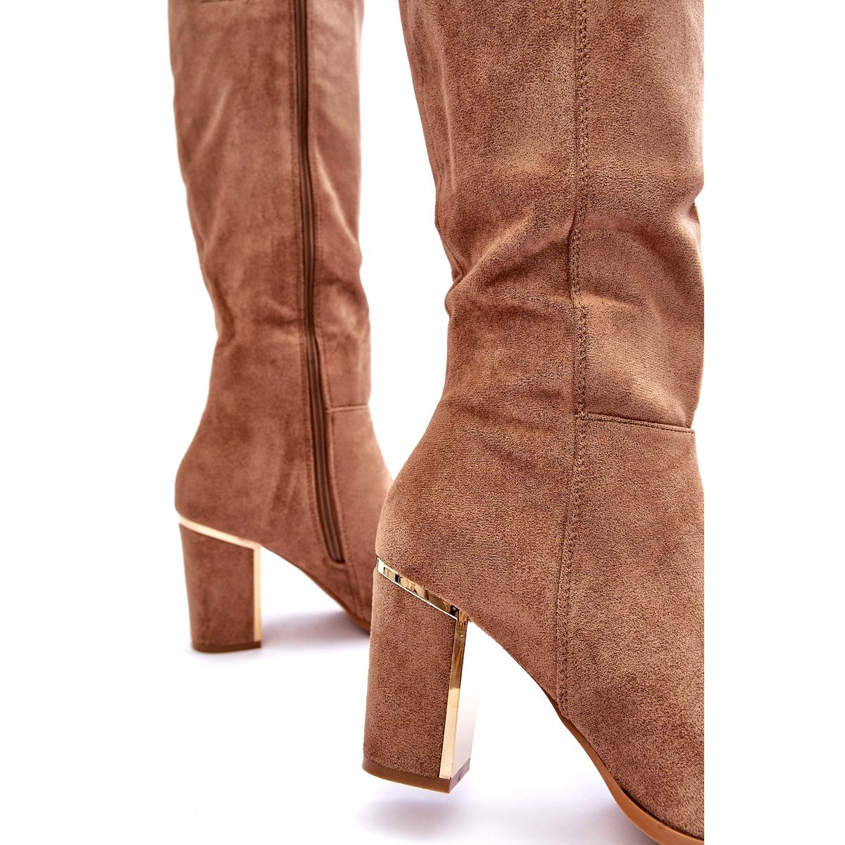 Sýstarské boty před kolenem na post - elegance a pohodlí v jednom. Vyrobeno z ekologického semiše v temném odstínu, budou dokonale doplňovat jak denně, tak formálnější stylizace. Klasický řez kulatým nosem a stabilním typem paty (8,5 cm) zajišťuje stylový vzhled při zachování pohodlí nošení.