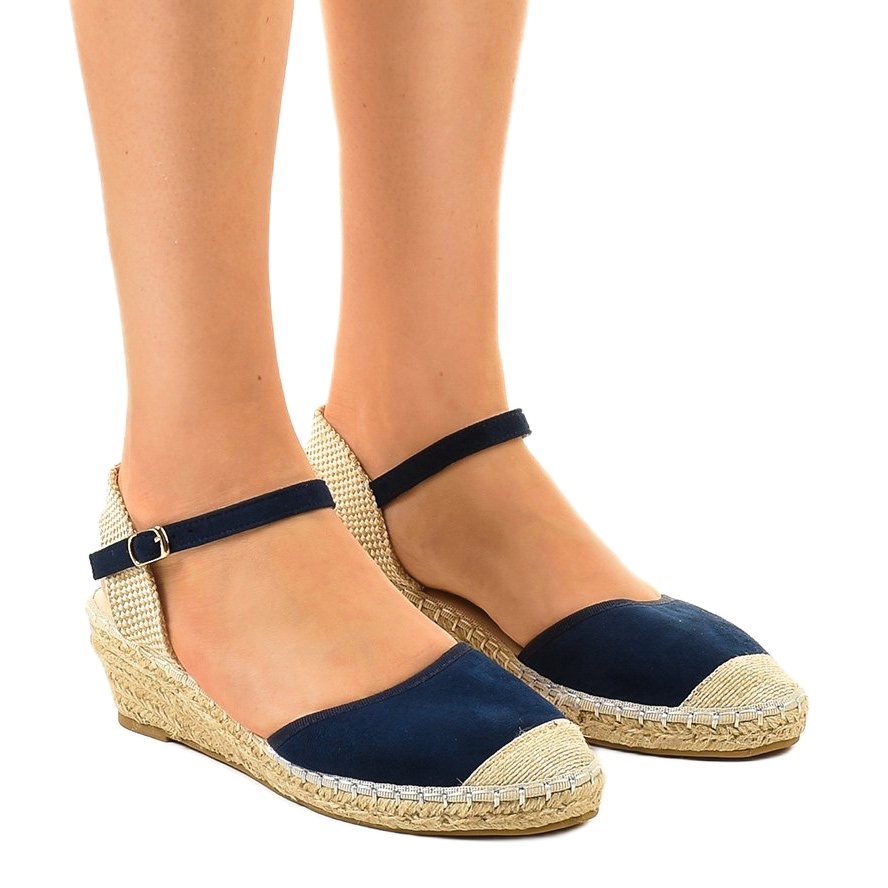 Přední strana espadrilek je postavena v tmavě modré barvě, která jim dodává klasický charakter. Boty mají vzadu otevřený podpatek, který nejen zvyšuje prodyšnost, ale dodává jim i originalitu. Je zde lehký látkový pásek a druhý modrý pásek s přezkou, který poskytuje dodatečnou stabilitu a pohodlí při nošení.