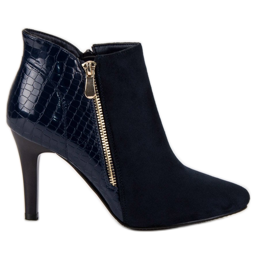 Námořnicky modré kotníkové boty na podpatku jsou perfektní volbou pro ženy, které chtějí spojit eleganci s trochou dravosti. Tyto jedinečné tmavě modré boty potěší svou originalitou a stylem. Jsou vyrobeny z vysoce kvalitních materiálů, kombinující ekologický semiš s lakovanou kůží, což jim dodává jedinečný charakter.