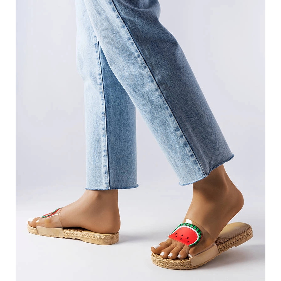 Moderní, skluzové žabky, které kombinují univerzální, transparentní design s jemnou dekorací s červenou planou. Ideální pro každodenní letní stylizace - pro procházku, k jezeru nebo pro rychlý výstup.