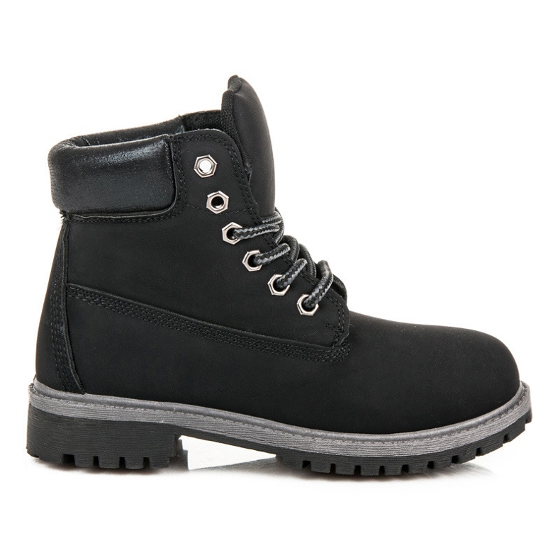 Klasické pohodlné boty Via Giulia - ideální pro chladnější dny. Vyrobeno z vysoce kvalitní, matné ekologické kůže v elegantní černé barvě, s jemnou, lesklou vsadkou nahoře a ozdobnými, trojitými jemnými švy, které botám dodávají módní charakter. Šněrované, takže je dobře přizpůsobíte noze a zabudovaná a vyztužená pata zajišťuje stabilitu při chůzi.