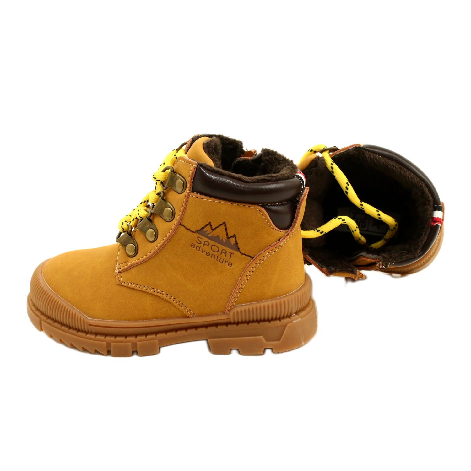 Stylové a teplé zpravodajské dětské lovnice, model 22DZ23-5256 ve stínu velblouda (žluté). Vyrobeno z vysoce kvalitní ekologické kůže, s měkkou obuvi uvnitř - ideální pro chladnější dny.