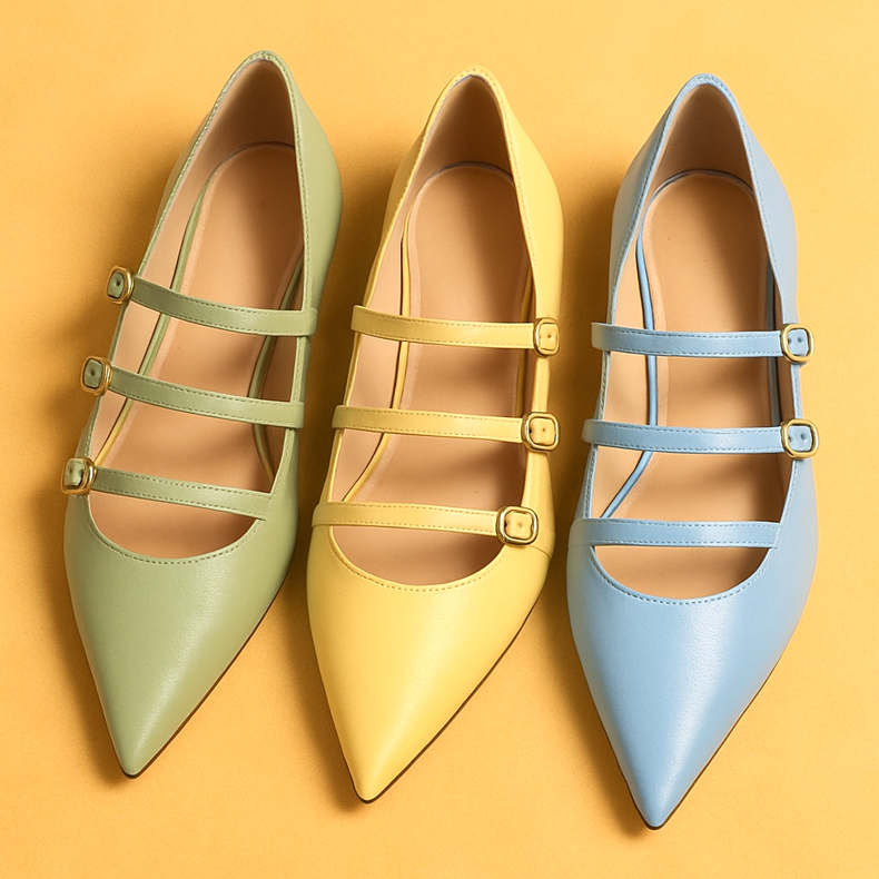 Baleríny neopouštějí piedestal, ale v roce 2026 mění svůj vzhled. Nejmódnější budou modely s ostrou špičatou špičkou, která opticky prodlouží nohy. Velký návrat zaznamenáváme také pruhy - balerínky ve stylu Mary Jane se dvěma nebo dokonce třemi pruhy na nártu jsou absolutní nutností. Barvy? Sladké pastely: pistáciová, baby blue a máslově žlutá.