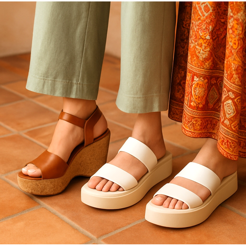 Pokud milujete podpatky, máme dobrou zprávu: pohodlné klínky a platformy jsou zpět, ale v odlehčené verzi. Městskému stylu budou dominovat sandály s korkovou podrážkou ve stylu 70. let a žabky plochého tvaru. Jsou stabilní, přidávají centimetry a skvěle se hodí k módním širokým palazzo kalhotám a maxi šatům v boho stylu.