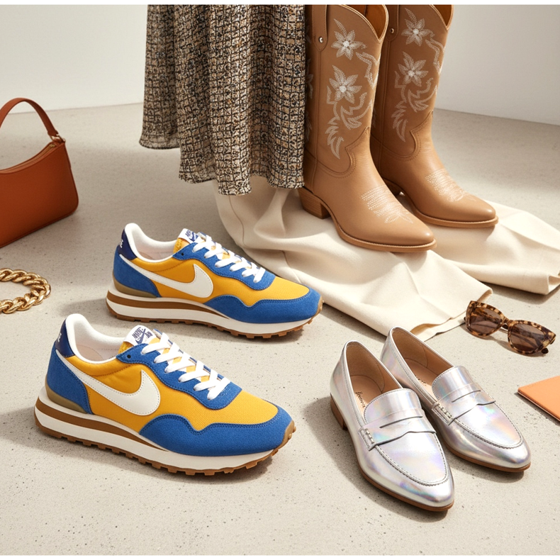 Rok 2026 je velkým návratem estetiky 70. a 90. let minulého století v obuvi. Návrháři použili archivní vzory a vdechli jim nový život. Jedním z nejoblíbenějších projevů tohoto trendu jsou retro-běžecké tenisky – boty inspirované klasickými běžeckými modely ze 70. let, které se vyznačují štíhlou siluetou, charakteristickým profilem podrážky a odvážnými barevnými kombinacemi.