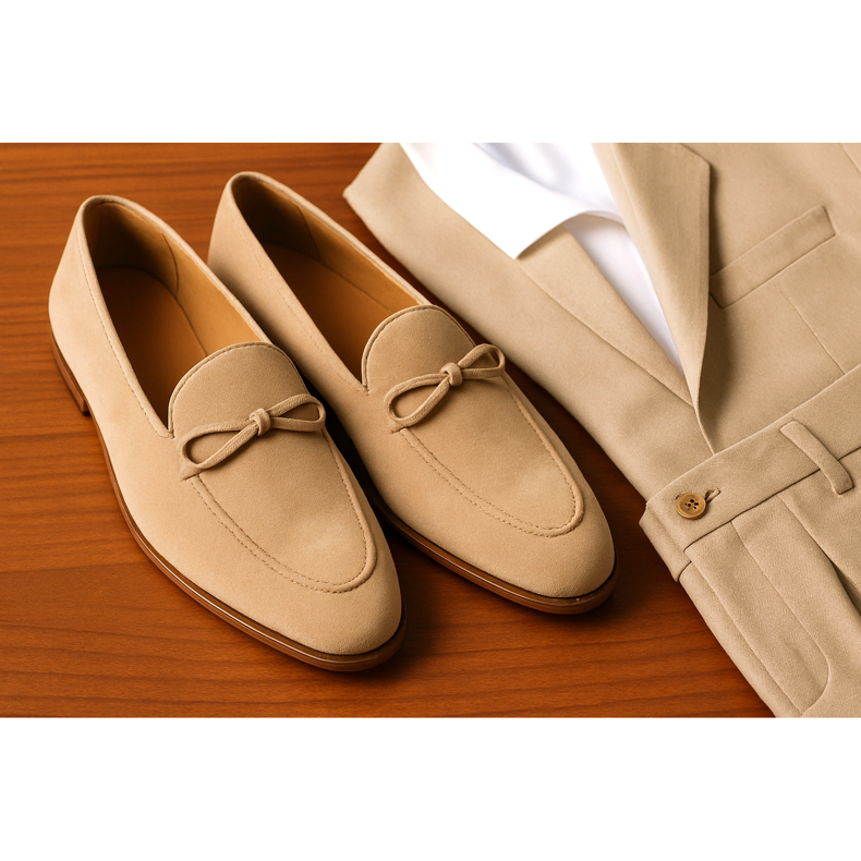 Belgické mokasíny světle hnědé + béžové plátěné kalhoty + plátěná košile (bez ponožek).