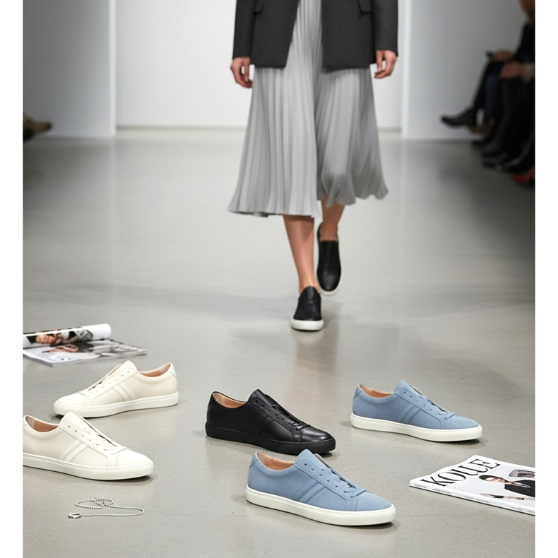 Tento trend se objevil na přehlídkových molech Celine, Miu Miu a Dries Van Noten, kde se ploché minimalistické tenisky kombinovaly s elegantními sukněmi a dlouhými kalhotami. Účinek? Silueta je protáhlá, lehká a moderní. Boty téměř splývají s podlahou, a přesto vypadají působivě díky důrazu na kvalitu a čistý design.