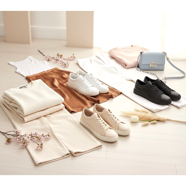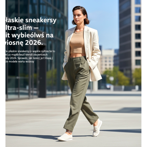 První nabídka: krémové ultratenké tenisky s širokými nohavicemi ve stejném odstínu a volnou vypasovanou mikinou se strukturovaným tvarem. Monochromatický vzhled s jemným nádechem textury - působí minimalisticky a velmi stylově. Druhý návrh: bílé slim tenisky s fluidní saténovou sukní v karamelové nebo champagne barvě a jednoduchým bílým topem. Tato kombinace je elegantní a ležérní zároveň. Třetí návrh: černé ultraštíhlé tenisky jako kontrast k zářivým jarním barvám - bílá džínovina, bledě růžový svetr a pastelová kabelka.