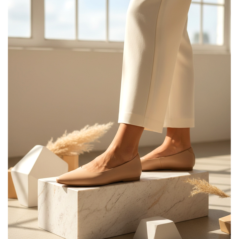 Ultratenký design boty – její tenký profil a prodloužená špička – však často vynahrazuje nedostatek podpatku. Nohy v takových botách vypadají delší než v tradičních plochých teniskách s kulatou špičkou a silnou podrážkou. Pár v barvě podobné vaší pleti nebo béžové se doporučuje zejména nižším osobám - efekt optického prodloužení je opravdu patrný.