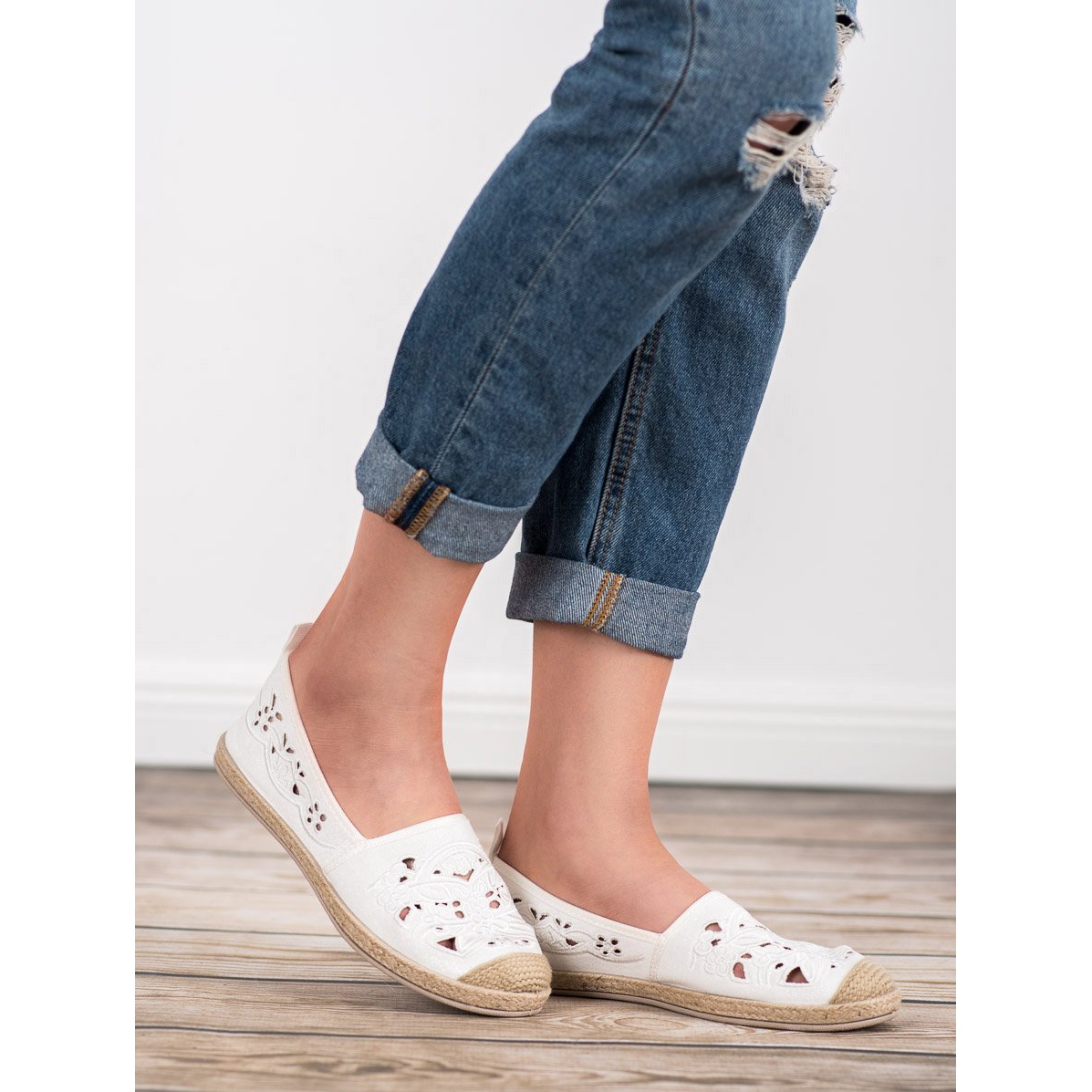 Díky bílé barvě bot dokonale ladí s různými letními styly a dodává jim svěžest a lehkost. Díky prolamovanému vzoru a navlékacímu zapínání jsou tyto espadrilky nejen atraktivní, ale také praktické, ideální pro každodenní použití.