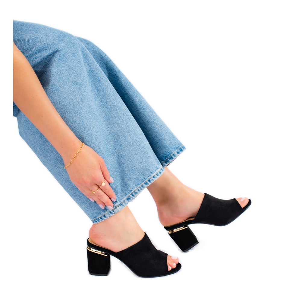 Tyto mules s otevřenou patou jsou skvělou volbou pro každodenní nošení. Díky nazouvacímu zapínání je jejich nasazování extrémně snadné. Vyrobeny z imitace semiše, vypadají perfektně jak na pláž, tak na procházky městem. Klasická černá barva dodává eleganci a hodí se k mnoha různým outfitům.