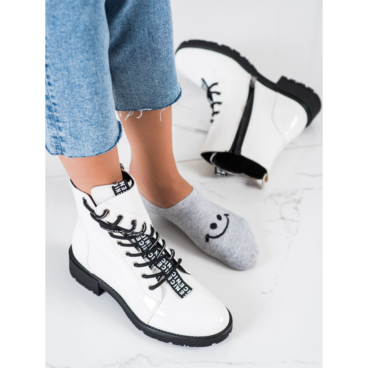 Praktický zip a detaily na šněrování usnadňují oblékání a svršek o výšce 14 cm a šířce 24 cm perfektně sedí na noze. Díky bílým barvám a kulaté špičce jsou tyto dělnice extrémně univerzální – perfektně se hodí k různým stylům, od džínů po šaty, a dodávají jim trochu syrové šik.